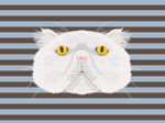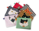 The cat face is hand drawn and printed on plush velvet with a stripe background. Backed and lined in cotton with a colour contrast zip and tabs.