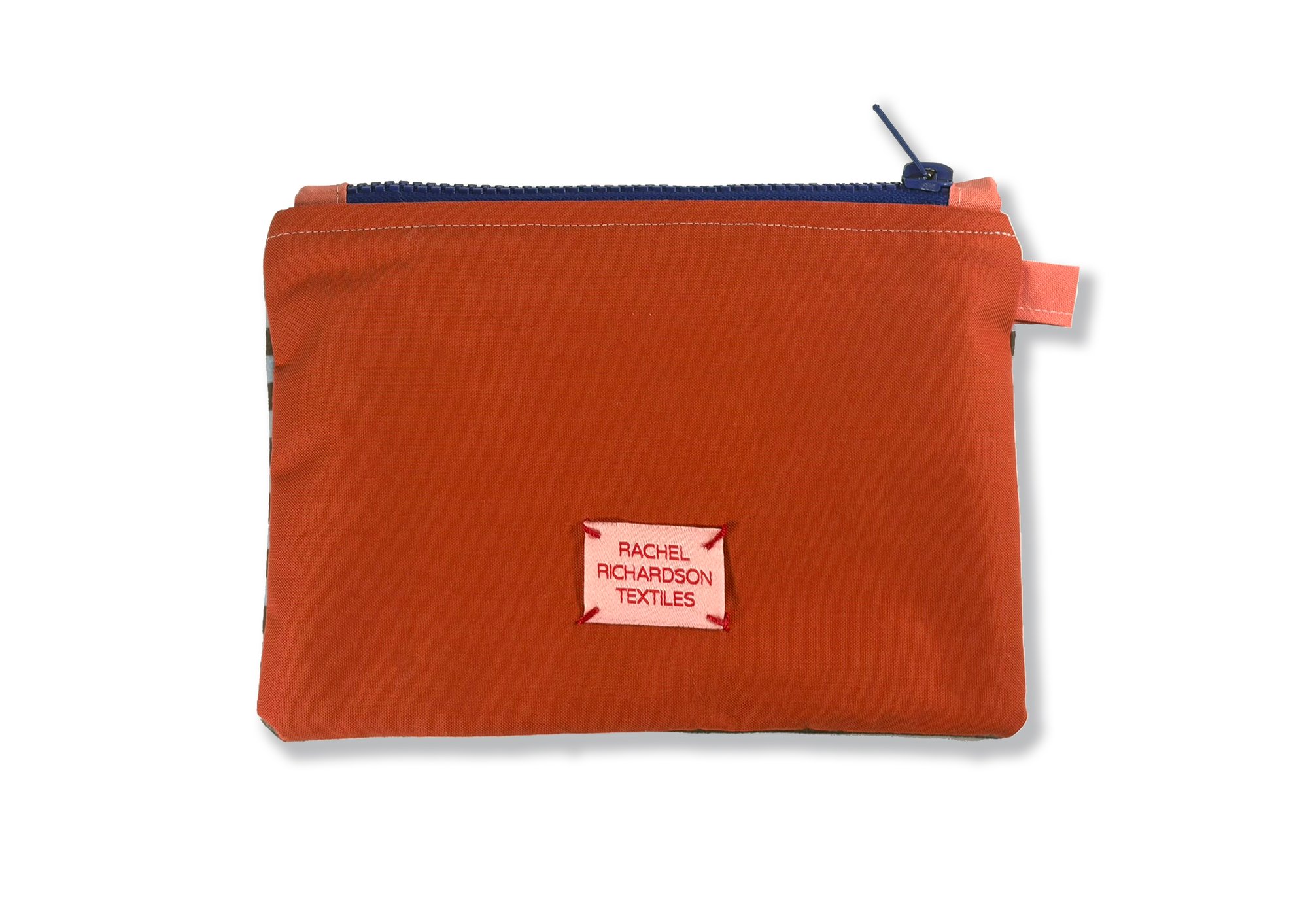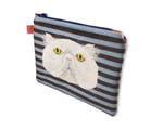 This purrrrticular pouch features a Persian cat with a blue and chocolate background. The back panel and lining is in a rust orange, the zip is electric blue and the tabs are in salmon pink.