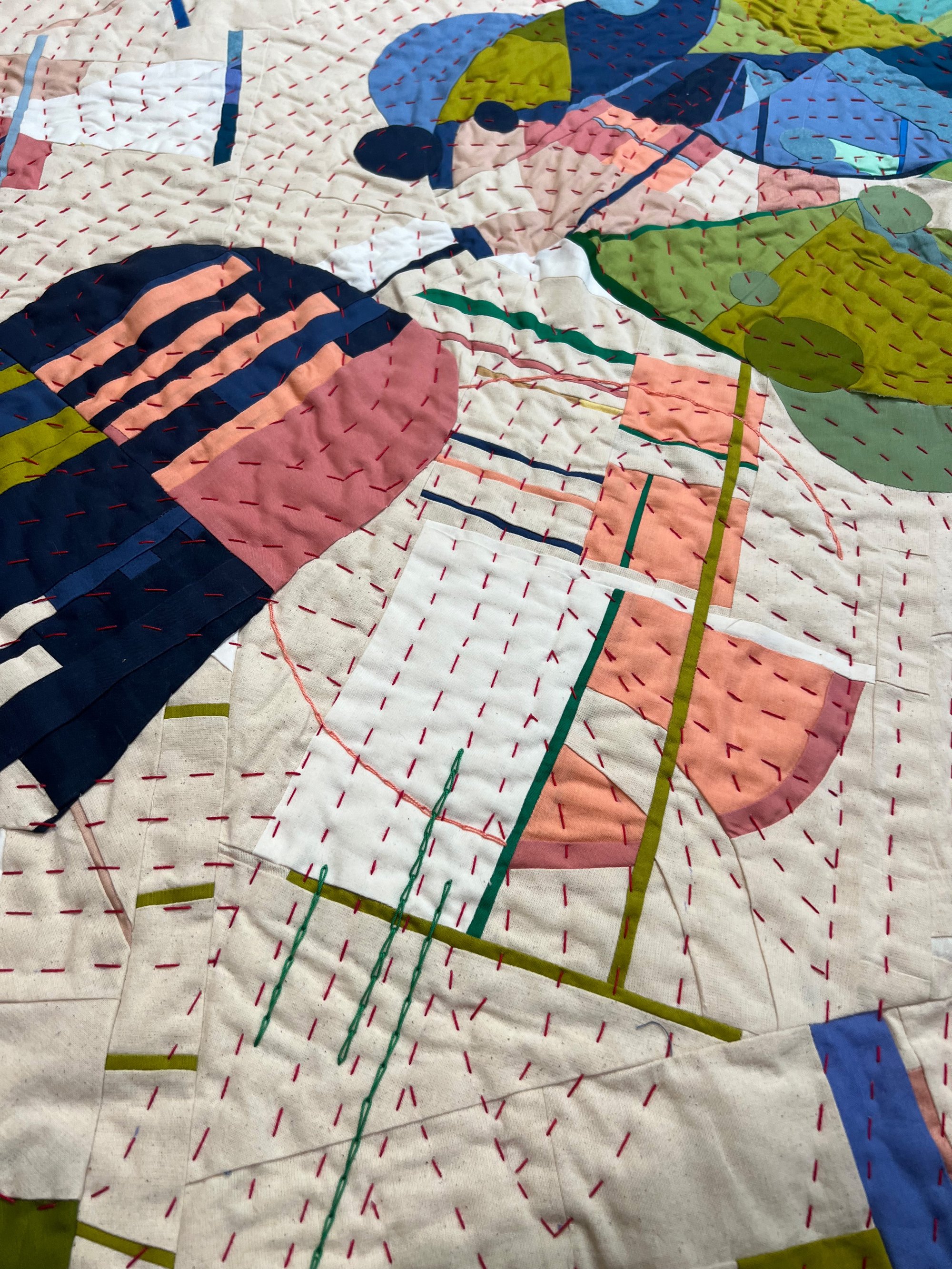 This quilt has an abstract composition using blocks of colours, the background consists of various shades of neutral. The three 'wings' are quilted and appliquéd and the entire quilt is top stitch in red contrast thread. This quilt is edged with mitre corners in a mix of natural with shots of red and blue.