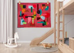This quilt has an abstract composition in a pops of colours and shapes layered and appliquéd on to a hand printed fabric. The base fabric has a checker board design and the quilt is hand stitched in a red cotton thread, giving the illusion that the stitches disappear and reappear.