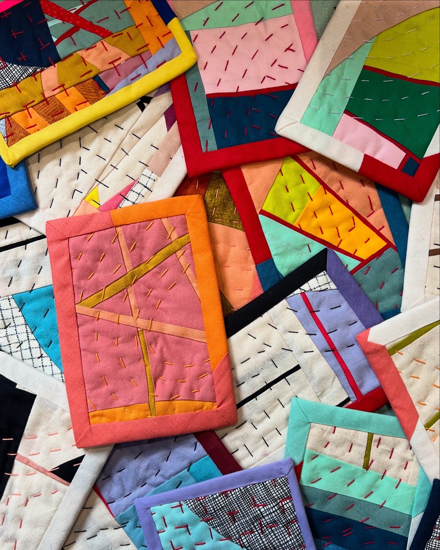 Postcard quilts are made from off cuts and trial pieces of the bigger quilts, each one unique and the size of a post card (hence the name).